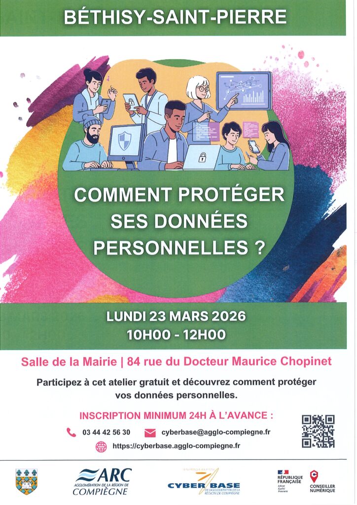 Atelier Cyber Base du lundi 23 mars 2026 Le 23 mars 2026 de 10h00 à 12h00 Participez à cet atelier gratuit et découvrez comment protéger vos données personnelles.